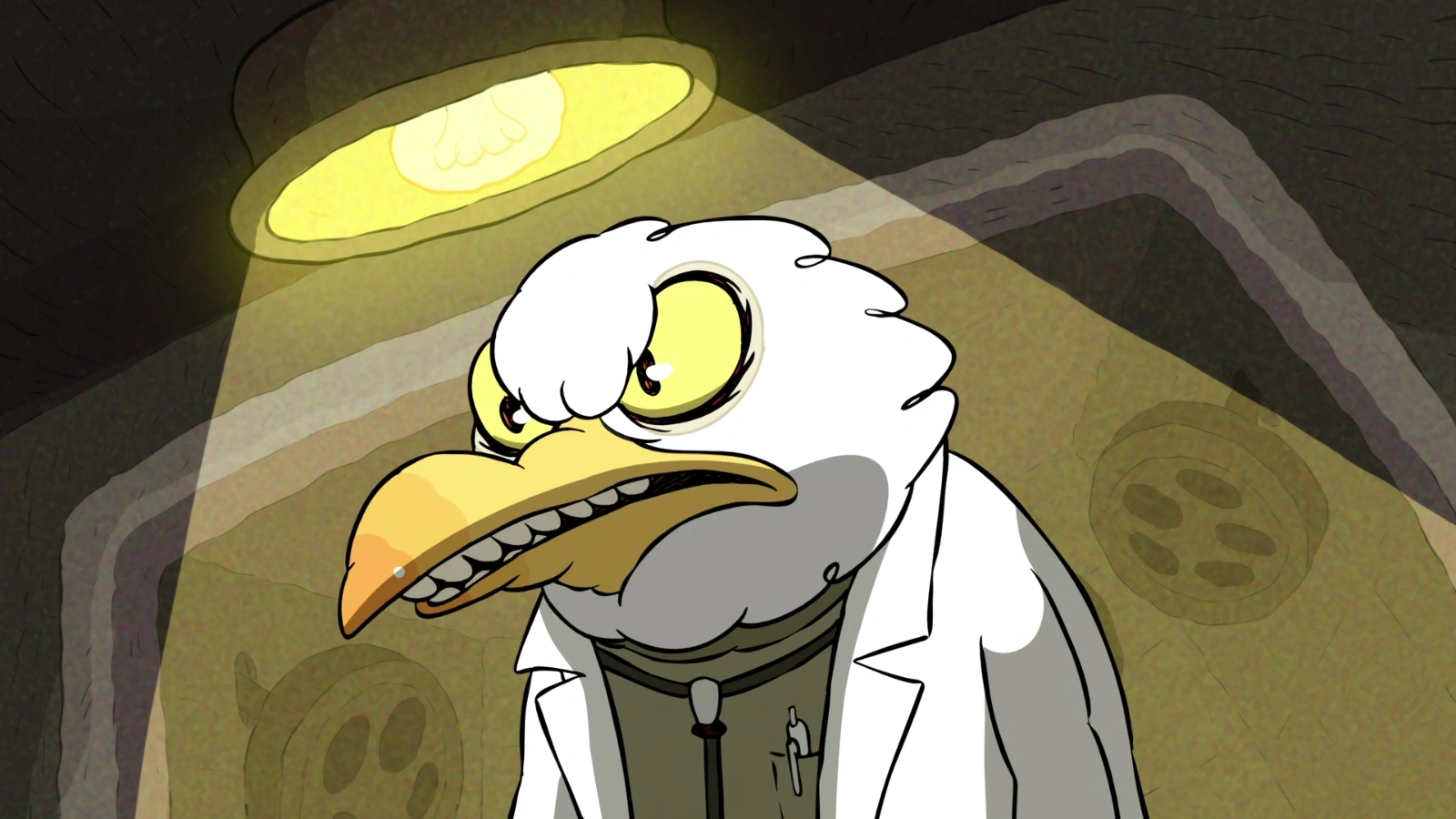 Dr. Cronenbird is an anthropomorphic loon who is white in color. He wears a white doctor's coat and gray shirt with a stethoscope worn around his neck and goggles on his forehead. He also wears brown and black striped pants and black shoes.